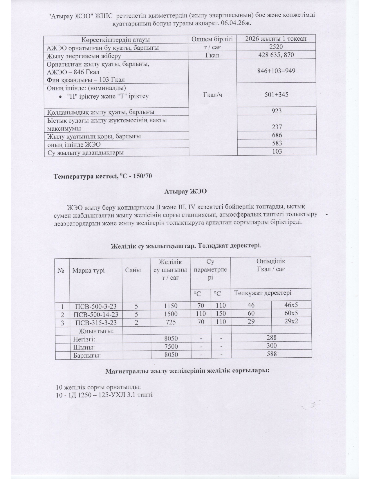 Информация о наличии свободных и доступных мощностей регулируемых услуг (тепловой энергии) АО «Атырауская ТЭЦ»