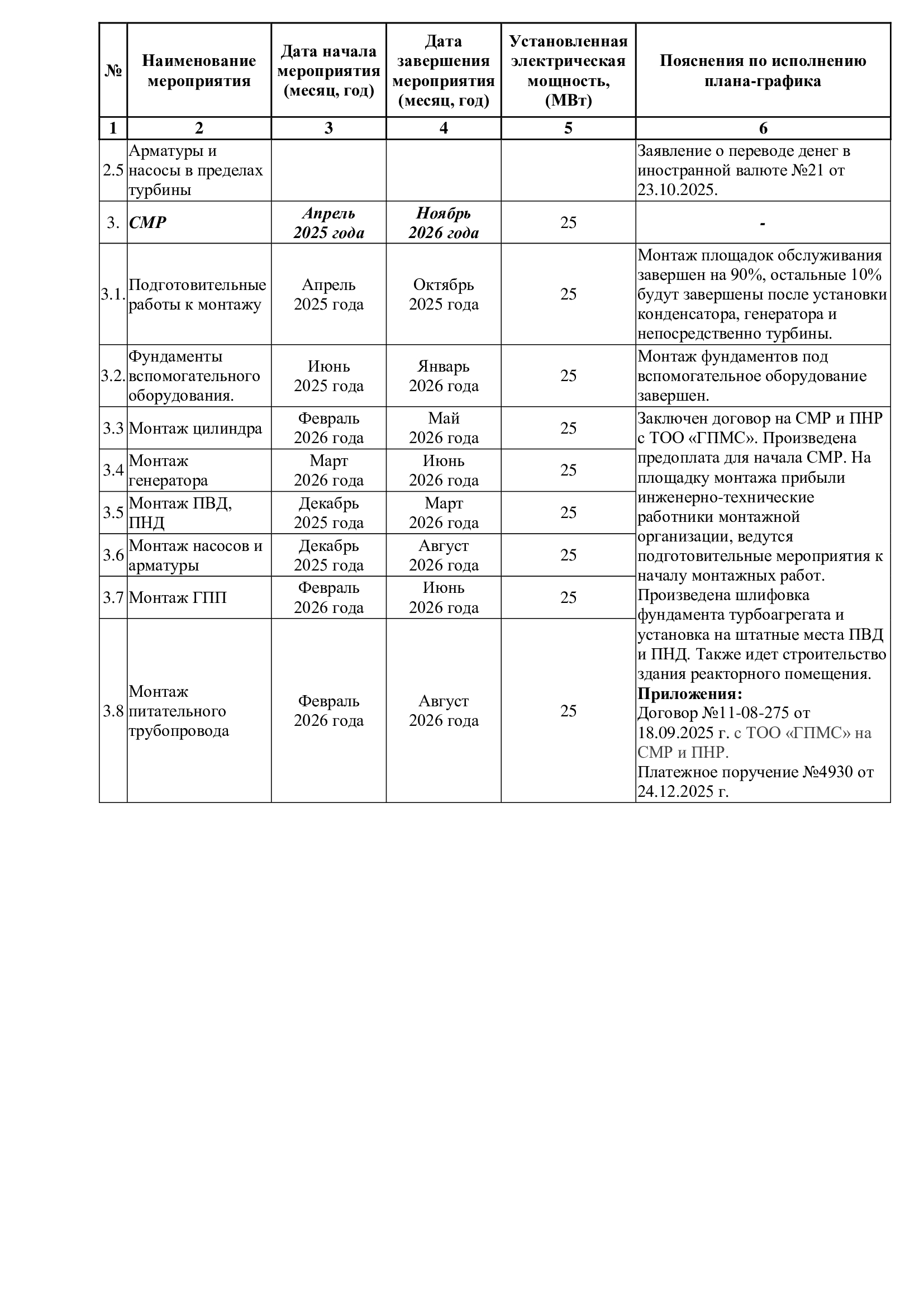 - Отчет по исполнению плана-графика подготовки и реализации проекта строительства газотурбинных установок за декабрь 2025 года.