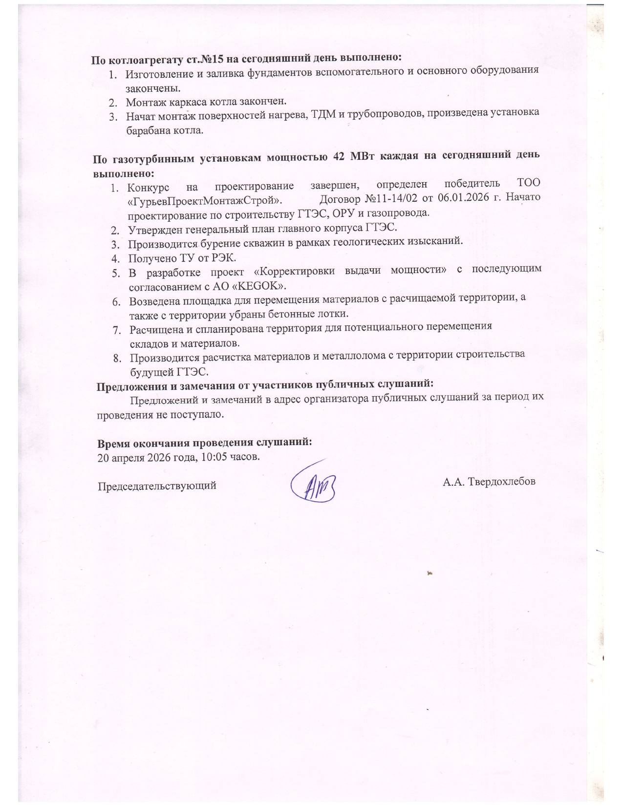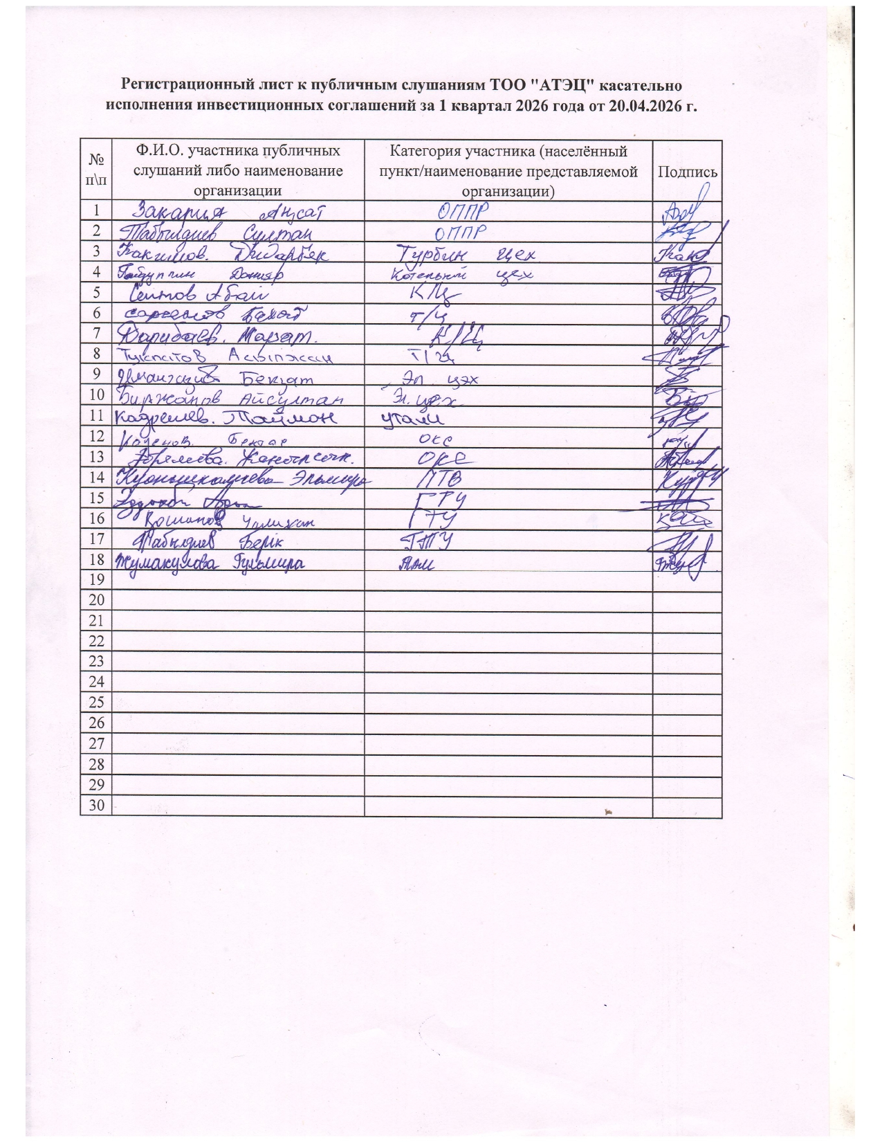 Протокол публичных слушаний ТОО "АТЭЦ" касательно исполнения инвестиционных соглашений за 1 квартал 2026 года от 20.04.2026 г.