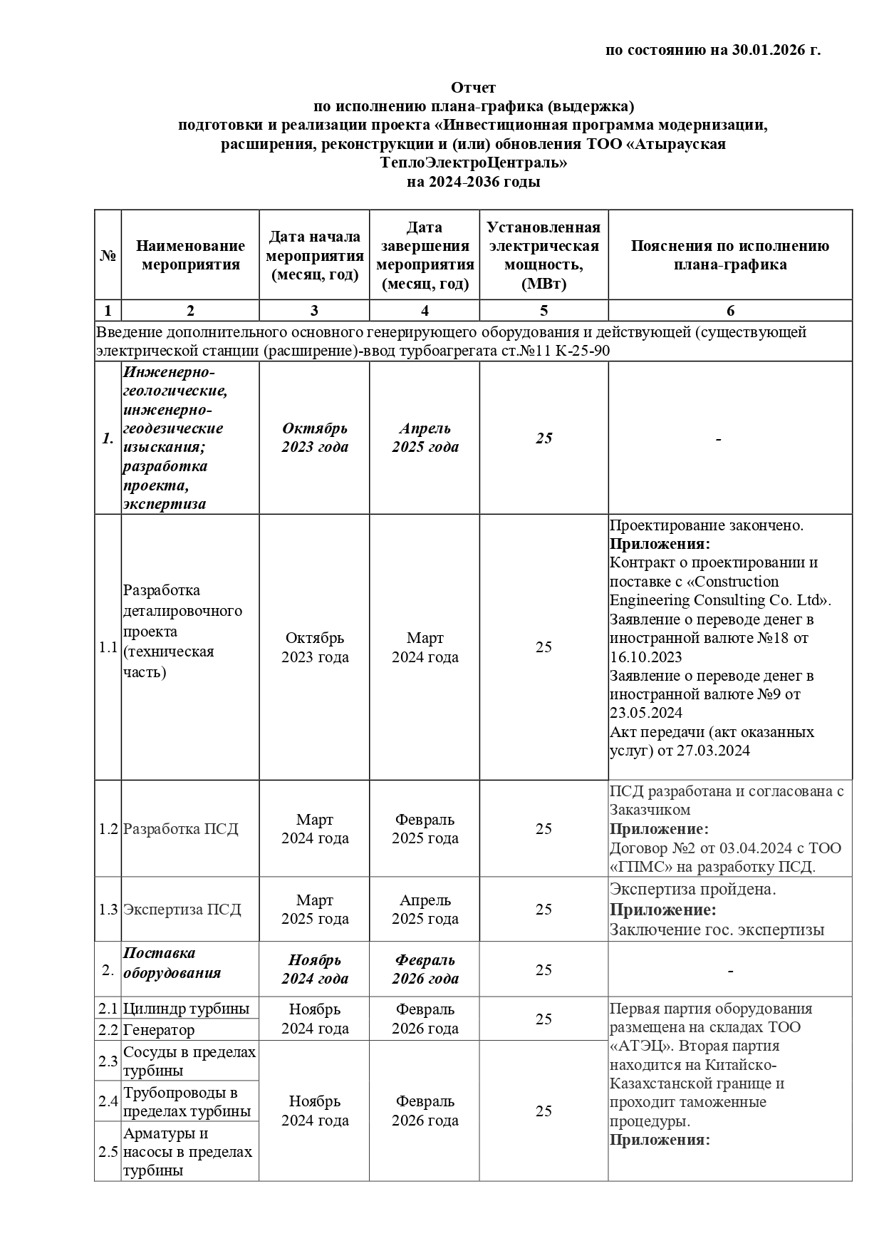 - Отчет по исполнению плана-графика подготовки и реализации проекта «Инвестиционная программа модернизации, расширения, реконструкции и (или) обновления АО «Атырауская ТеплоЭлектроЦентраль» на 2024-2036 годы