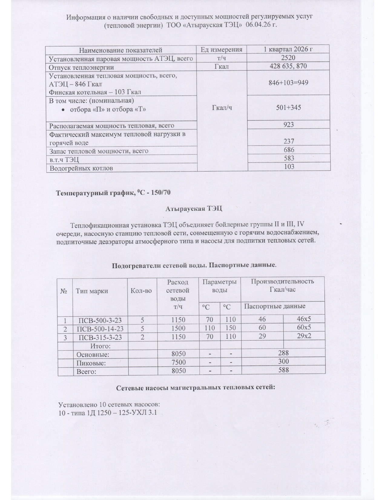 Информация о наличии свободных и доступных мощностей регулируемых услуг (тепловой энергии) АО «Атырауская ТЭЦ»