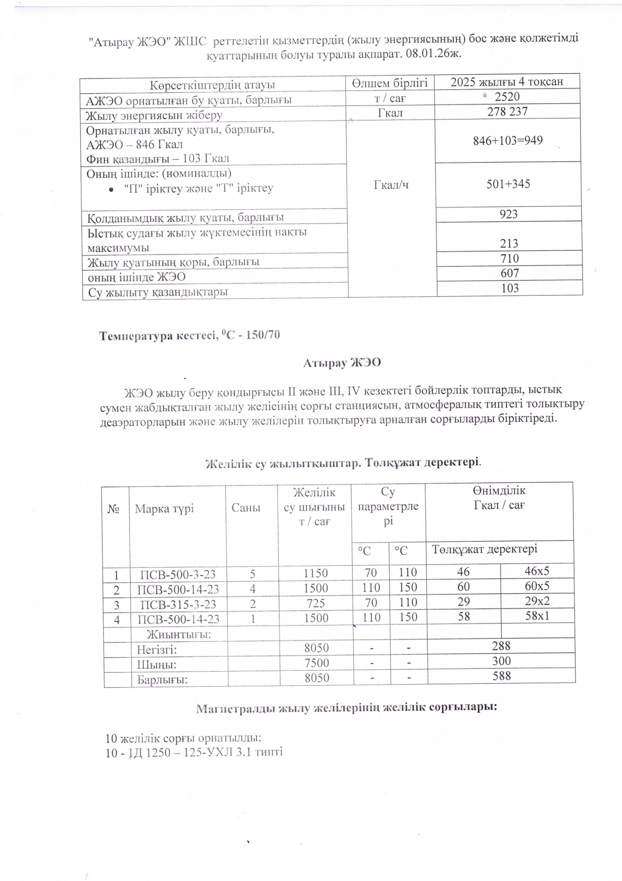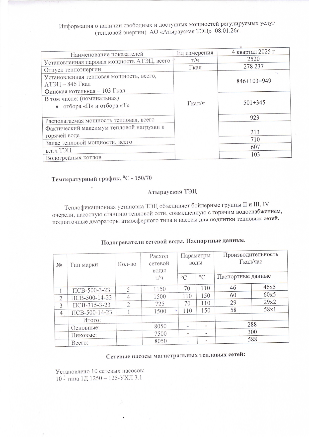 Информация о наличии свободных и доступных мощностей регулируемых услуг (тепловой энергии) АО «Атырауская ТЭЦ»