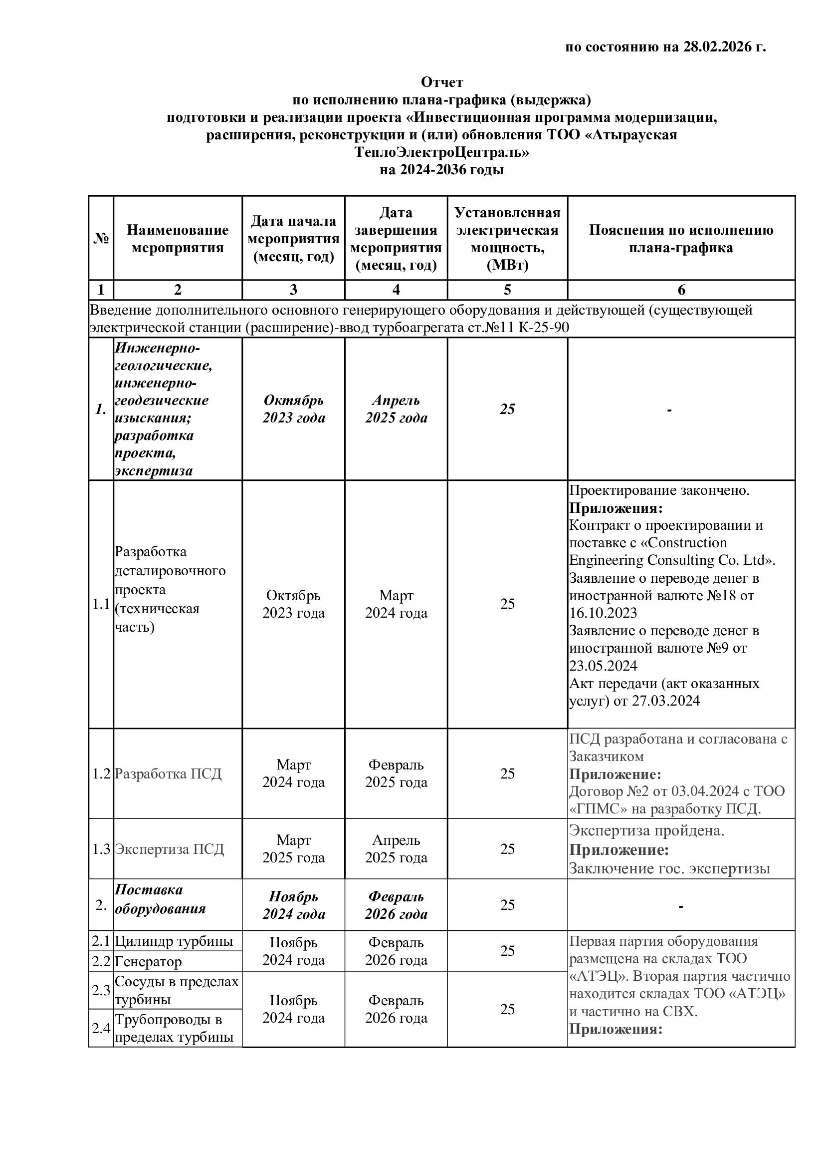 - Отчет по исполнению плана-графика подготовки и реализации проекта «Инвестиционная программа модернизации, расширения, реконструкции и (или) обновления АО «Атырауская ТеплоЭлектроЦентраль» на 2024-2036 годы