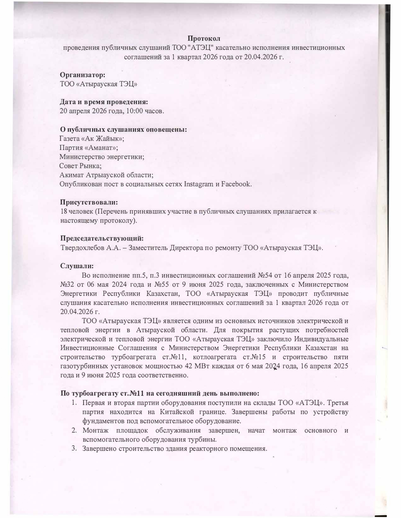 Протокол публичных слушаний ТОО "АТЭЦ" касательно исполнения инвестиционных соглашений за 1 квартал 2026 года от 20.04.2026 г.